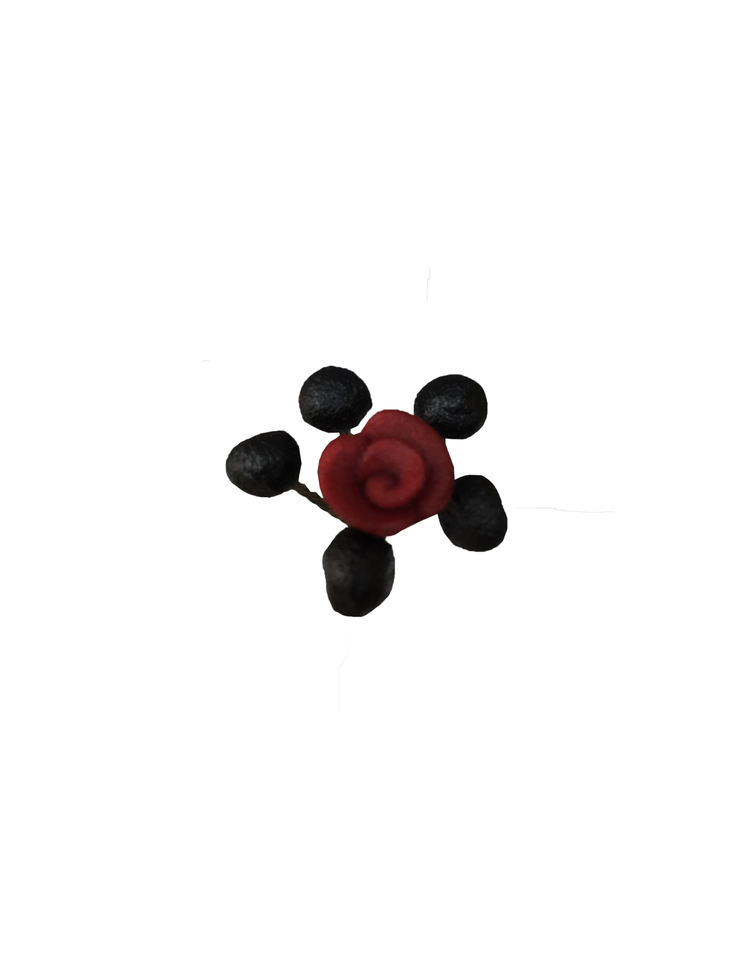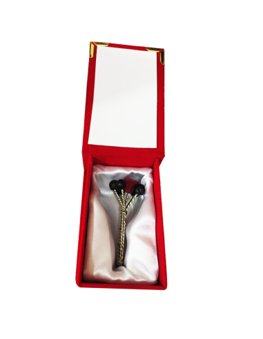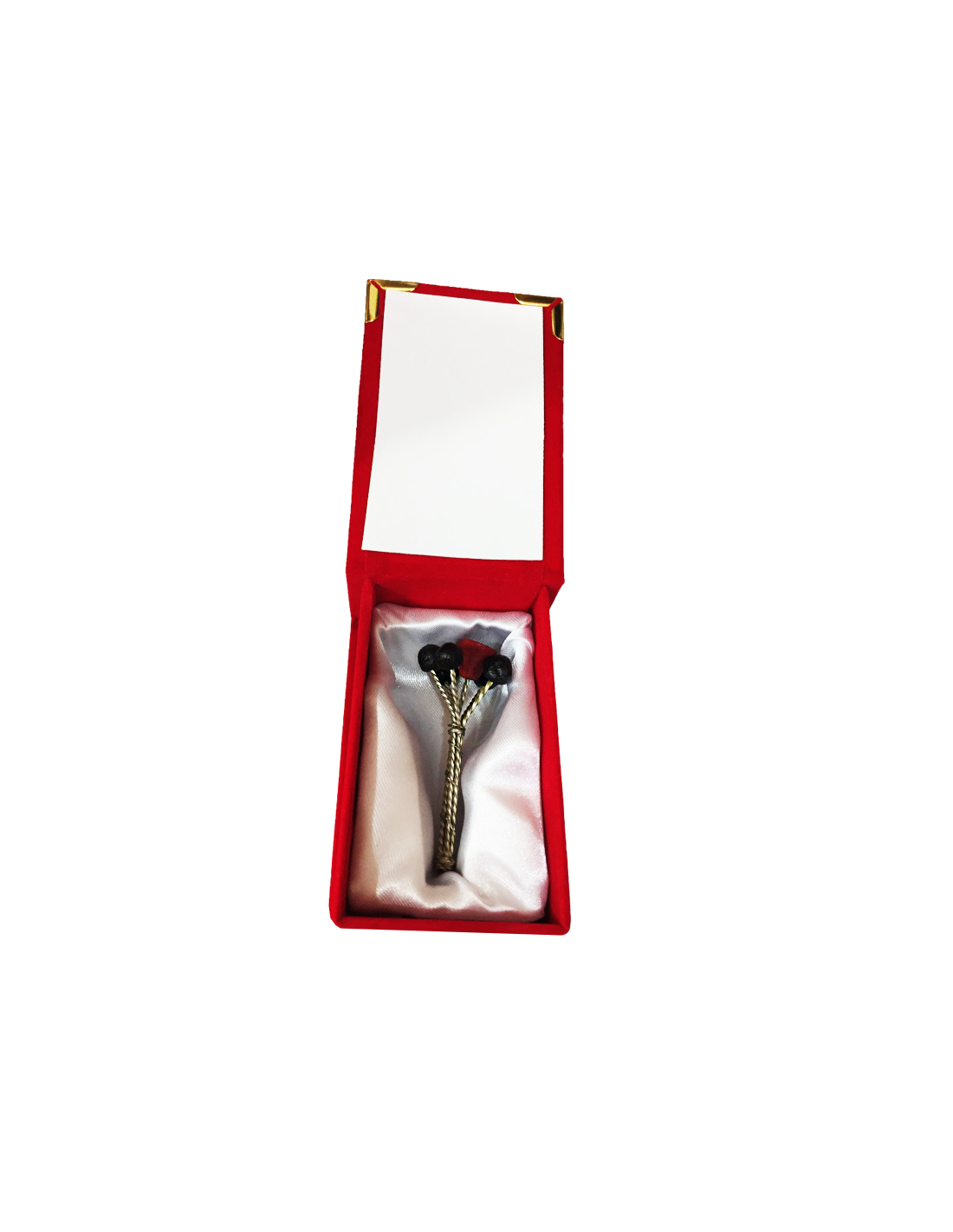 Ce coffret raffiné renferme une broche artisanale Tunisienne en forme de Machmoum, le bouquet traditionnel emblématique de la culture tunisienne. Finement travaillée à la main, la broche est composée de tiges en métal doré torsadé, ornée de perles noires évoquant l’ambre, et d’un tissu rouge symbolique.