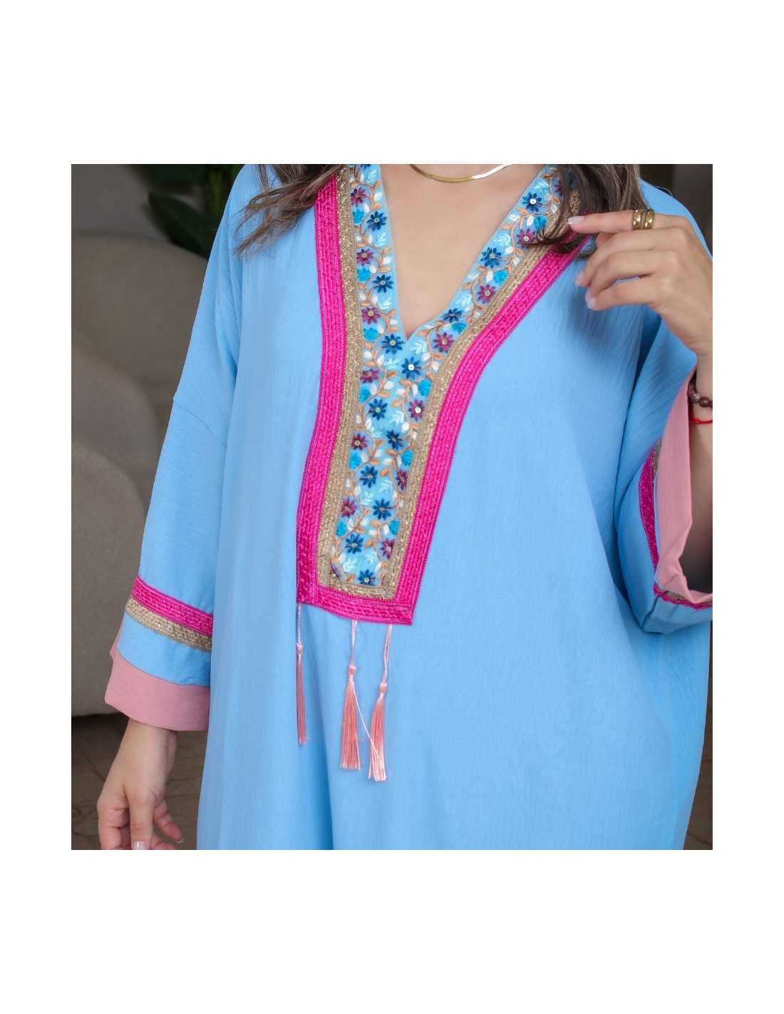 Laissez-vous séduire par la Jebba Bleu Ciel & Rose à Motifs, une création qui allie avec harmonie élégance moderne et charme traditionnel tunisien.