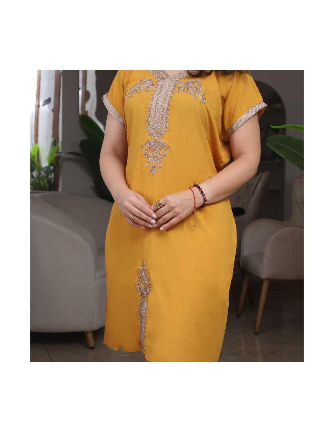 Sa coupe fluide et sa teinte dorée illuminent le teint, tandis que ses broderies fines couleur beige ajoutent une touche raffinée et féminine.