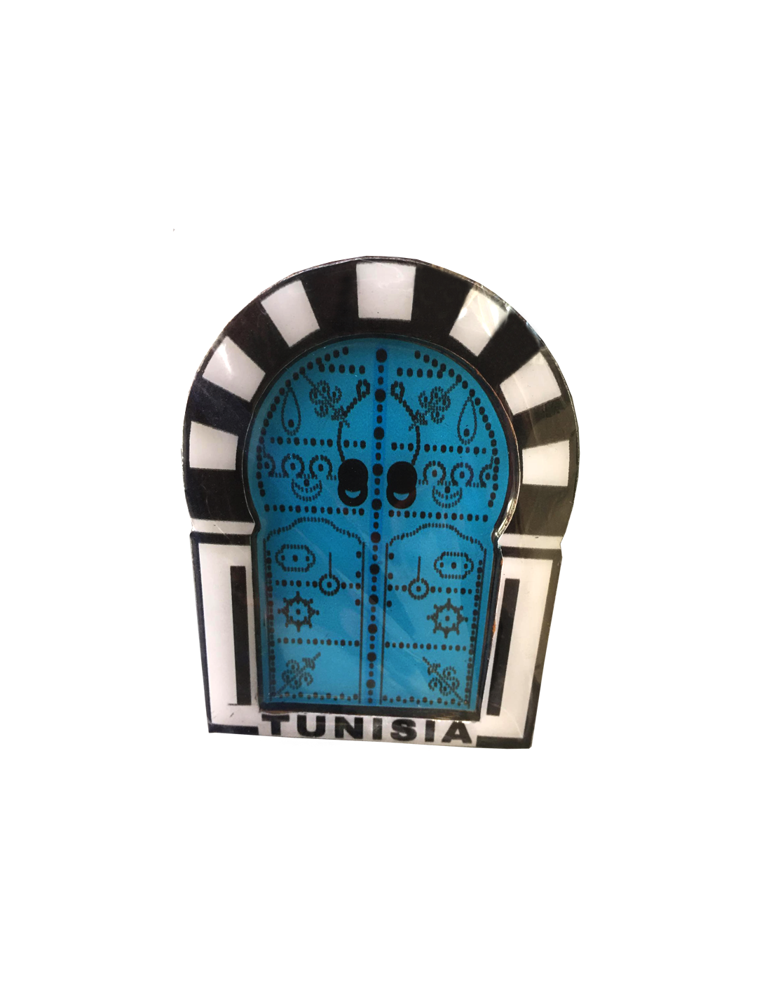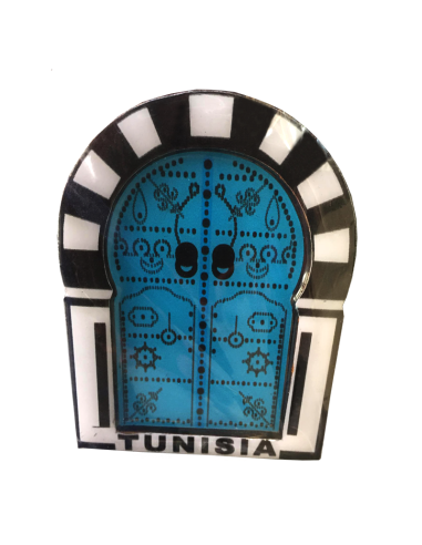 Ce magnet représente une porte traditionnelle bleue, typique du village de Sidi Bou Saïd, connu pour ses maisons blanches aux volets et portes d’un bleu éclatant. Entourée d’une arche en noir et blanc.